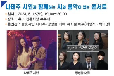 - 힐링 토크 콘서트: 6월 15일 오후 7시부터 나태주 시인과 함께하는 힐링 토크 콘서트가 열립니다.